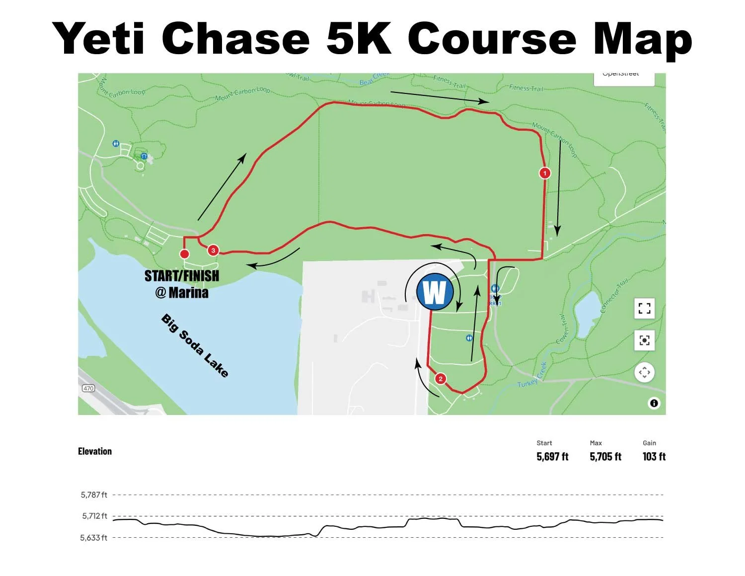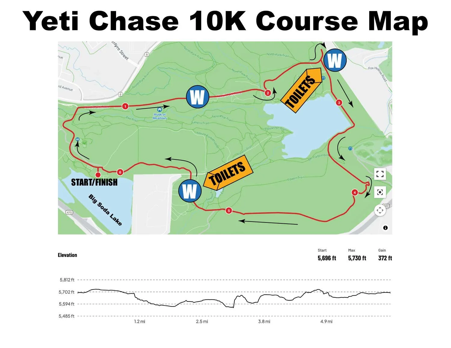 5K COURSE (map): The 5K course has some gentle ups and downs, as it follows a course that is predominantly park roads, with a final half mile on a paved multi-use path, and an exciting finish at the Big Soda Lake Marina.